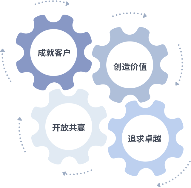 成就客户是一切决策的出发点,创造价值是衡量所有工作的标准,追求卓越是无极娱乐做事做人的态度,开放共赢是无极娱乐的格局也是最终的结果。价值观的齿轮环环相扣,推动着组织里的每个人不断向前。